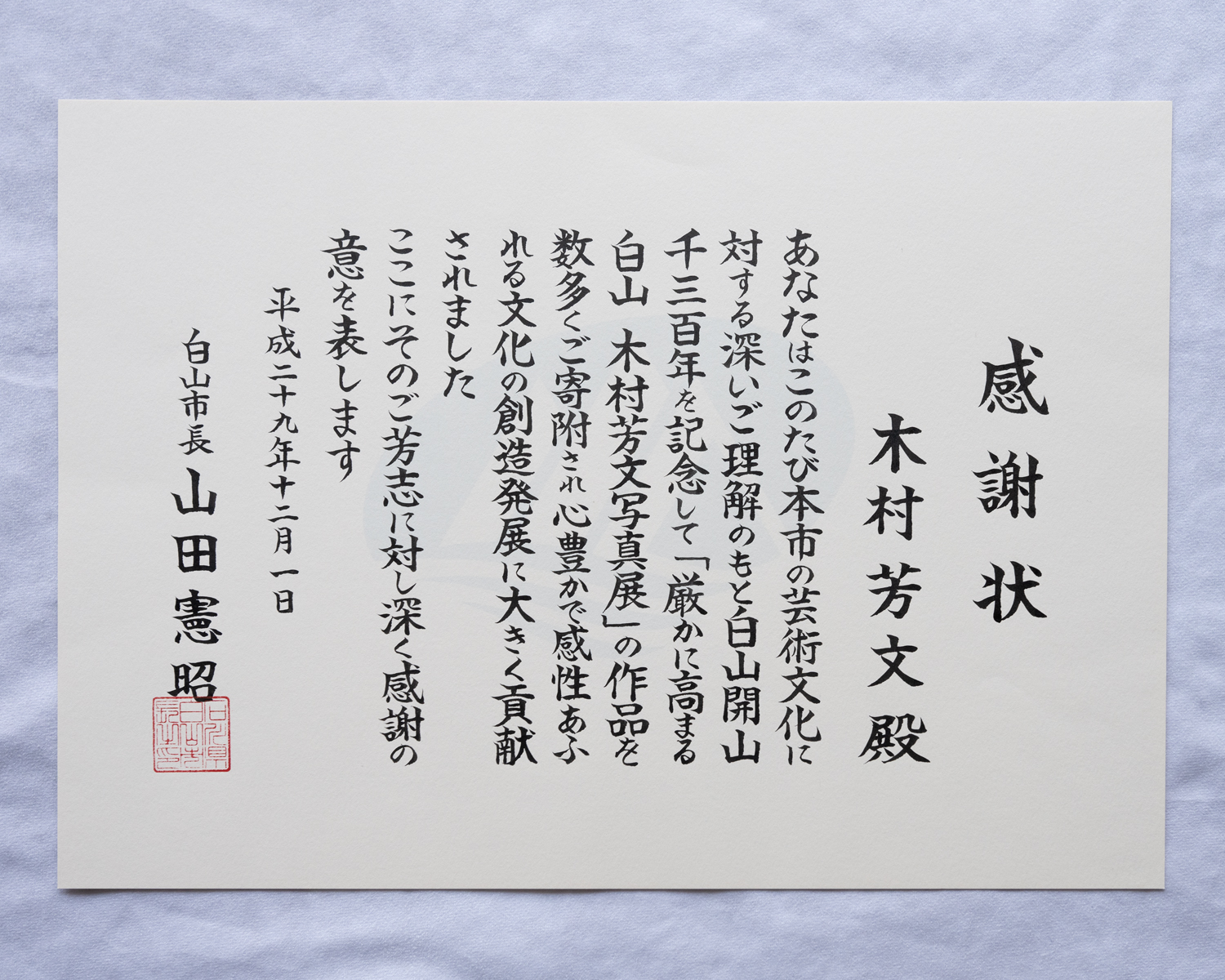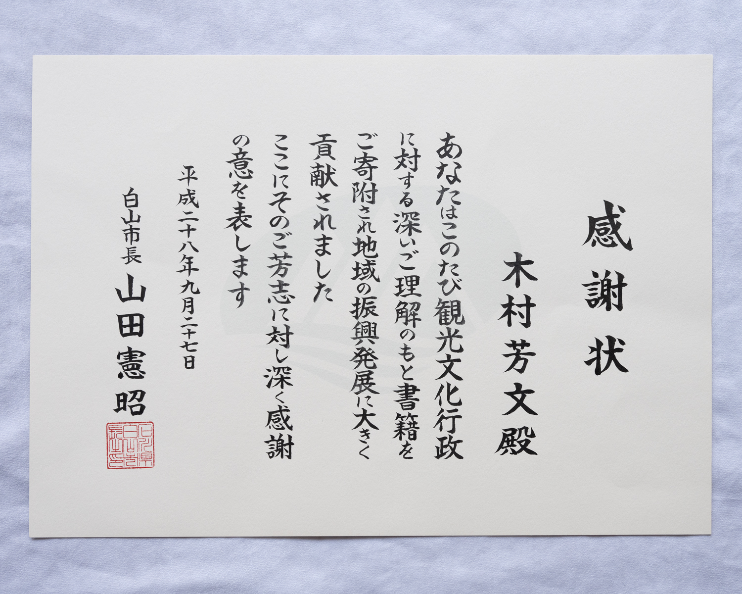 2011年 白山市へ『写真集 白山の恵みに生きる』寄贈 感謝状