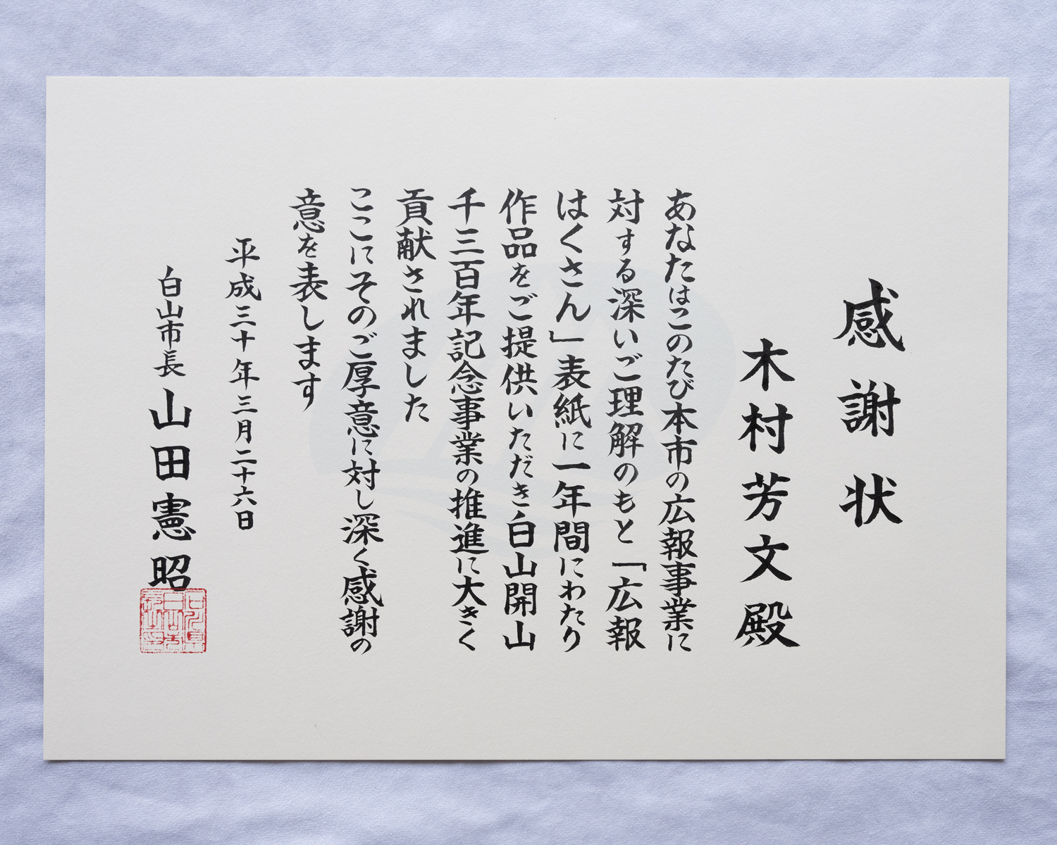 2018年 白山市・広報はくさん表紙用写真提供 感謝状