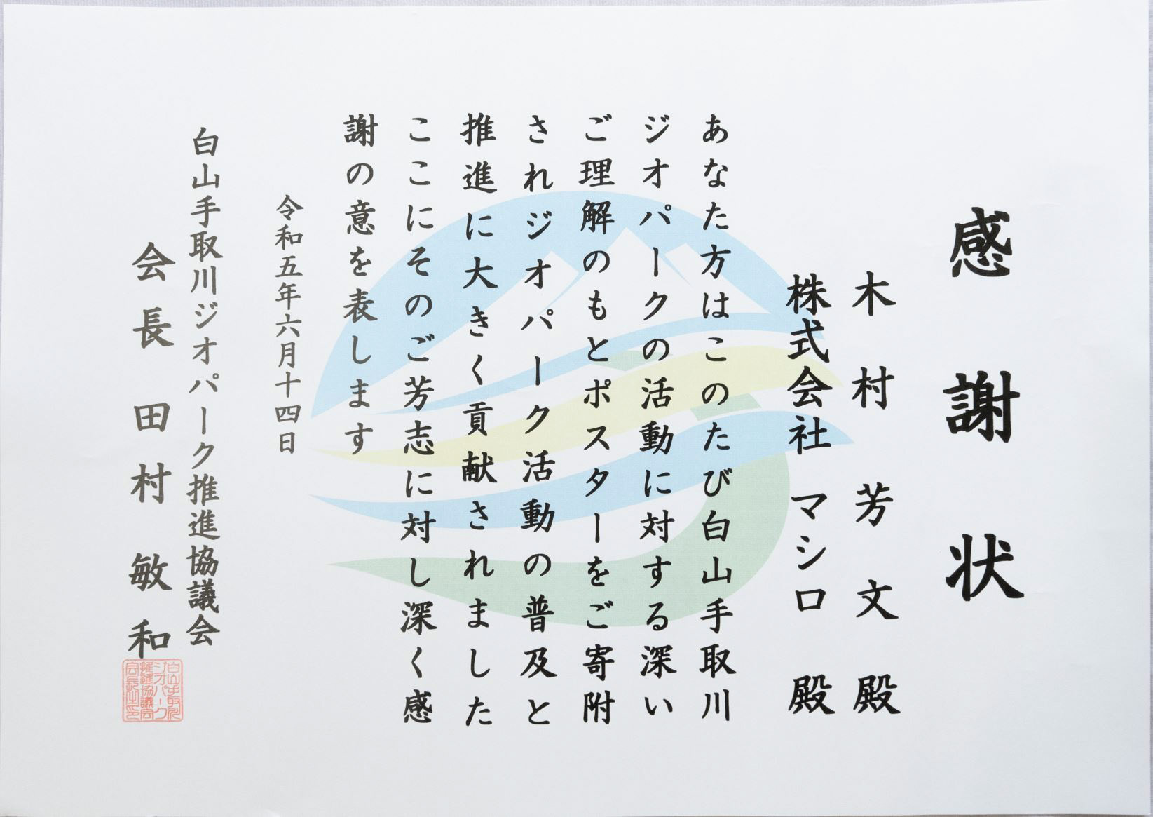 2023年 白山市へポスター7種(合計400枚)を寄贈 寄贈品 感謝状
